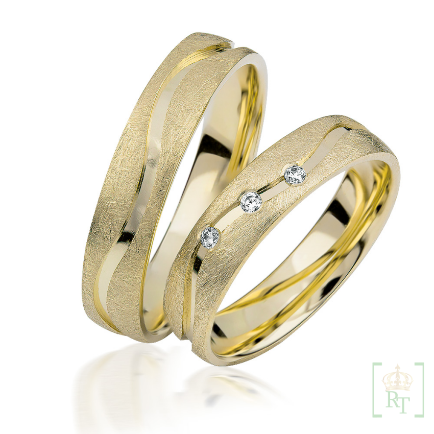 Deze goedkope geelgouden trouwringen S905 zijn mooi vormgegeven en zeer comfortabel te dragen door de afgeronde binnenkant. Golvende lijnen, ijsmattering over de ringen en in de damesring en subtiel geplaatste diamanten. Bekijk de ringen in Apeldoorn & Nijmegen of bestel de geelgouden trouwringen S905 direct in onze trouwringen webshop. Alle geelgouden trouwringen worden bij onze Oostenrijkse en Duitse trouwring fabrikanten met uiterste precisie en vakmanschap vervaardigd. Zij gebruiken de modernste apparatuur om uw trouwringen tot in de puntjes te vervaardigen om vervolgens door een strikte nacontrole in een mooie ringendoos met certificaat naar u als aanstaand bruidspaar te gaan.